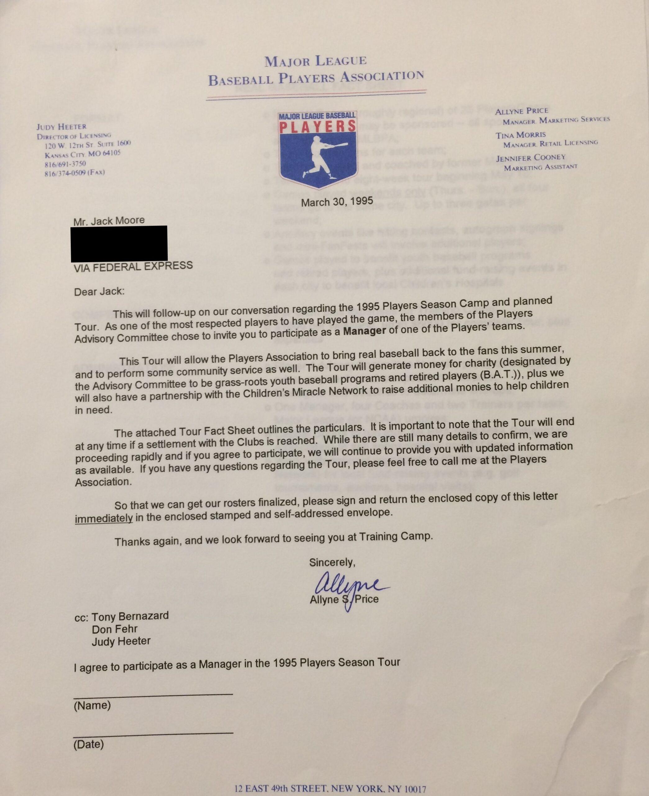 “We literally put four teams together, including coaching staffs, medical staffs, insurance for the players, clubhouse staffs, uniforms, etc.,” Price says. In addition to keeping the sport’s striking workforce busy, the tour would pay promotional dividends; one can picture the PR potential of a traveling roadshow composed of popular, low-paid players who would remind fans what they were missing and generate revenue for good causes while the wealthy owners whined about a salary cap. But once the injunction was upheld and it became clear that the season would soon start, Price explains, “we quickly turned our focus from barnstorming to finding a facility where we could send all the free agents and provide ‘one stop shopping’ for club scouts.”