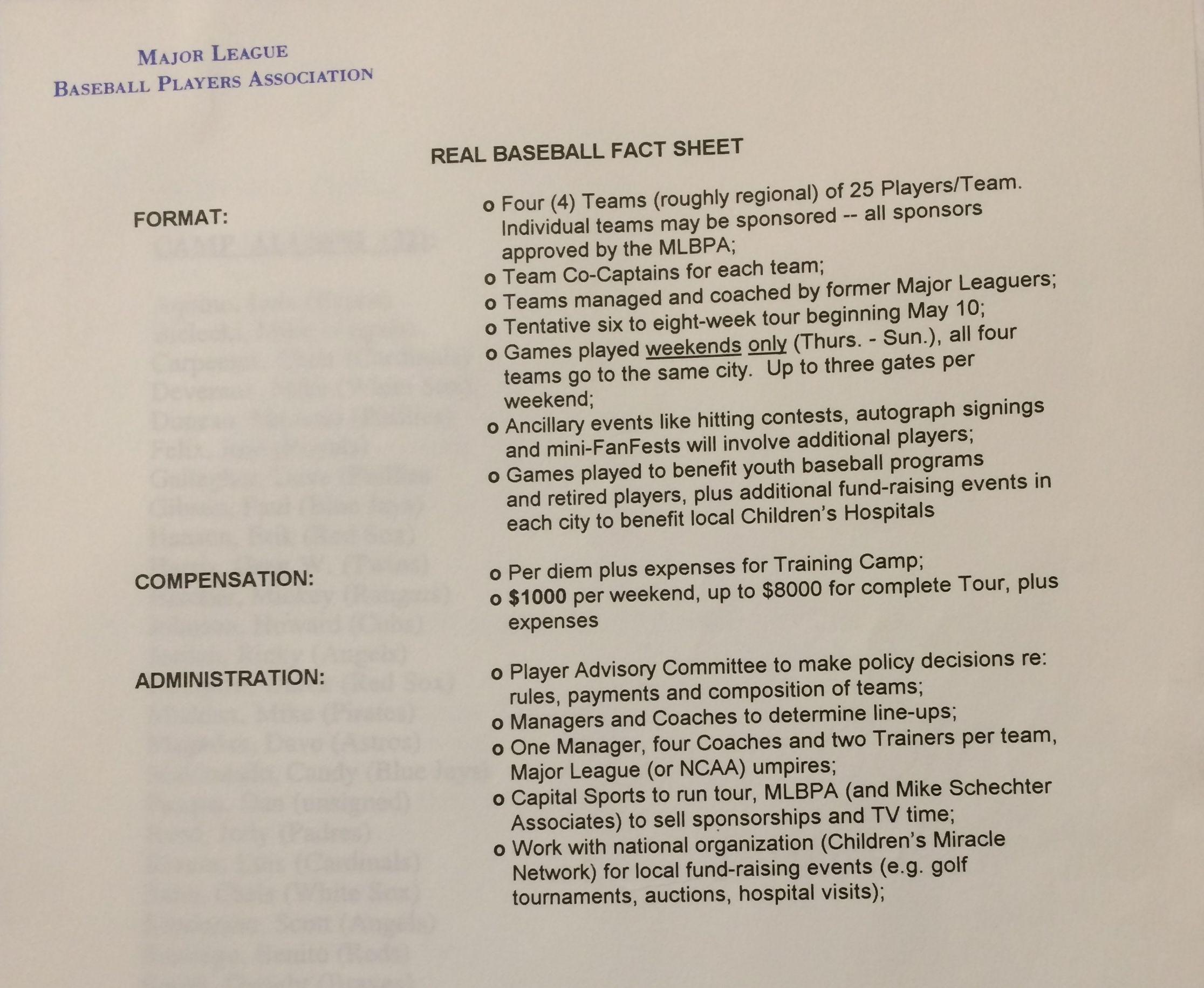 The union was capable of creating the camp—which at that time, really was without precedent, as far as Fehr knows—on short notice because it had already laid the groundwork for a more ambitious strike contingency plan. “The camp was originally never intended to be a camp,” says Price, who helped spearhead the MLBPA’s strike contingency plans, which started to coalesce in December ’94. Instead, the union intended to bring back a time-honored baseball tradition, the barnstorming tour. Selected players would form four teams—East, South, Central, and West—and play each other in weekend-only games in parks across the country (mostly minor league parks without MLB affiliations) for six to eight weeks, beginning in May. The union hired outside consultants to help secure the venues and an agency to sell sponsorships that would help fund the tour, which would also raise money for charity, including youth baseball programs, the Children’s Miracle Network, and the Baseball Assistance Team.