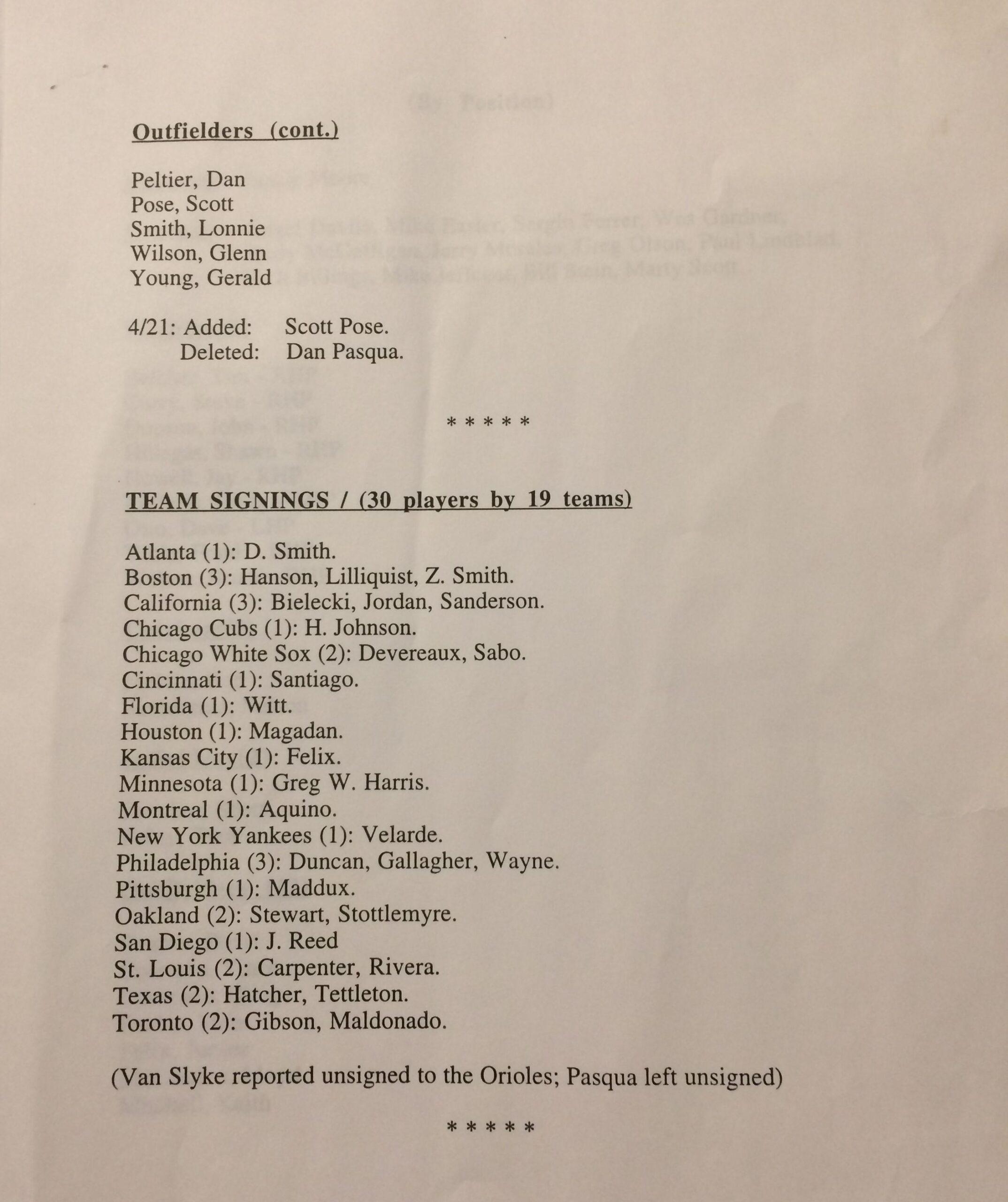 In the wake of the uncertain winter, though, many experienced big leaguers were still looking for places to play. According to an email from Allyne Price, a longtime MLB Players Association executive who was then the manager of marketing services and is now the general manager of player services, about 130 free agents (out of more than 350) were still unsigned. (Contemporary reports put the figure closer to 200.) Donald Fehr, the then–executive director of the MLB Players Association (who now serves in the same role for the NHLPA), explains via phone that the large remaining free-agent pool “was in large part a result of the strike, the fact that it had gone on so long, the fact that the owners had unilaterally changed the rules [midwinter].” When the owners had tried to impose their will without the players’ consent, the union had instructed players not to sign contracts. Later, the owners’ labor relations committee stripped signing power from individual teams, which were bleeding dollars by the day while the work stoppage lengthened. Because of what was, in effect, a “double signing freeze,” Fehr says that the post-strike market “had a lot of players in the very unusual situation of not knowing where to go that you would expect would eventually hook up with major league teams.”