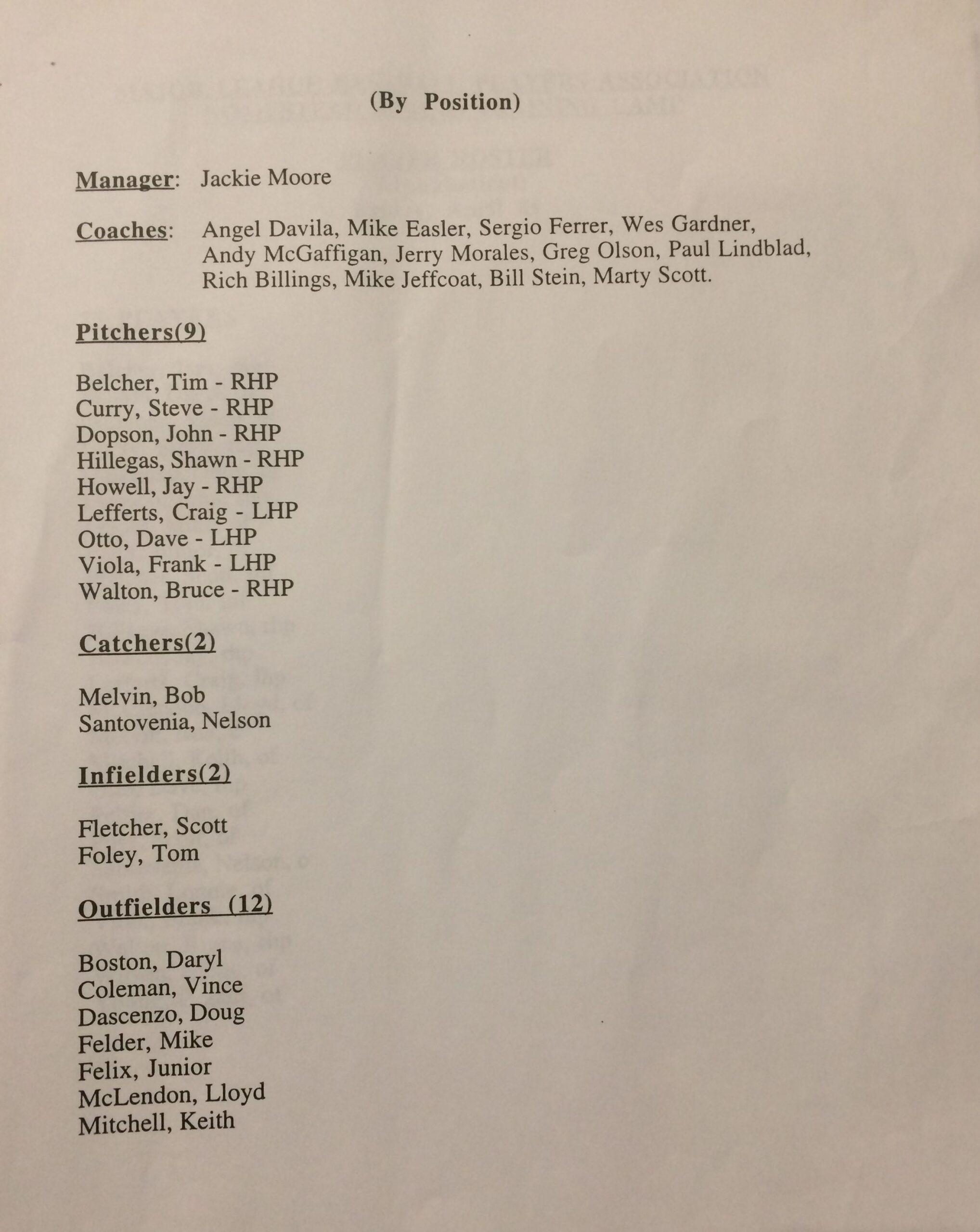 The opportunity to manage the ragtag free-agent team went to Jackie Moore, a widely respected “baseball man” who played in 21 major league games (all in 1965) and, after retiring from catching, spent decades as a coach or manager for several organizations, including parts of three seasons as Oakland A’s skipper in the mid-1980s. Moore had been the bench coach for the Rangers from 1993 to 1994, and would become the bench coach for the Rockies from 1996 to 1998, but he didn’t have a home for 1995, which made him a free agent also.