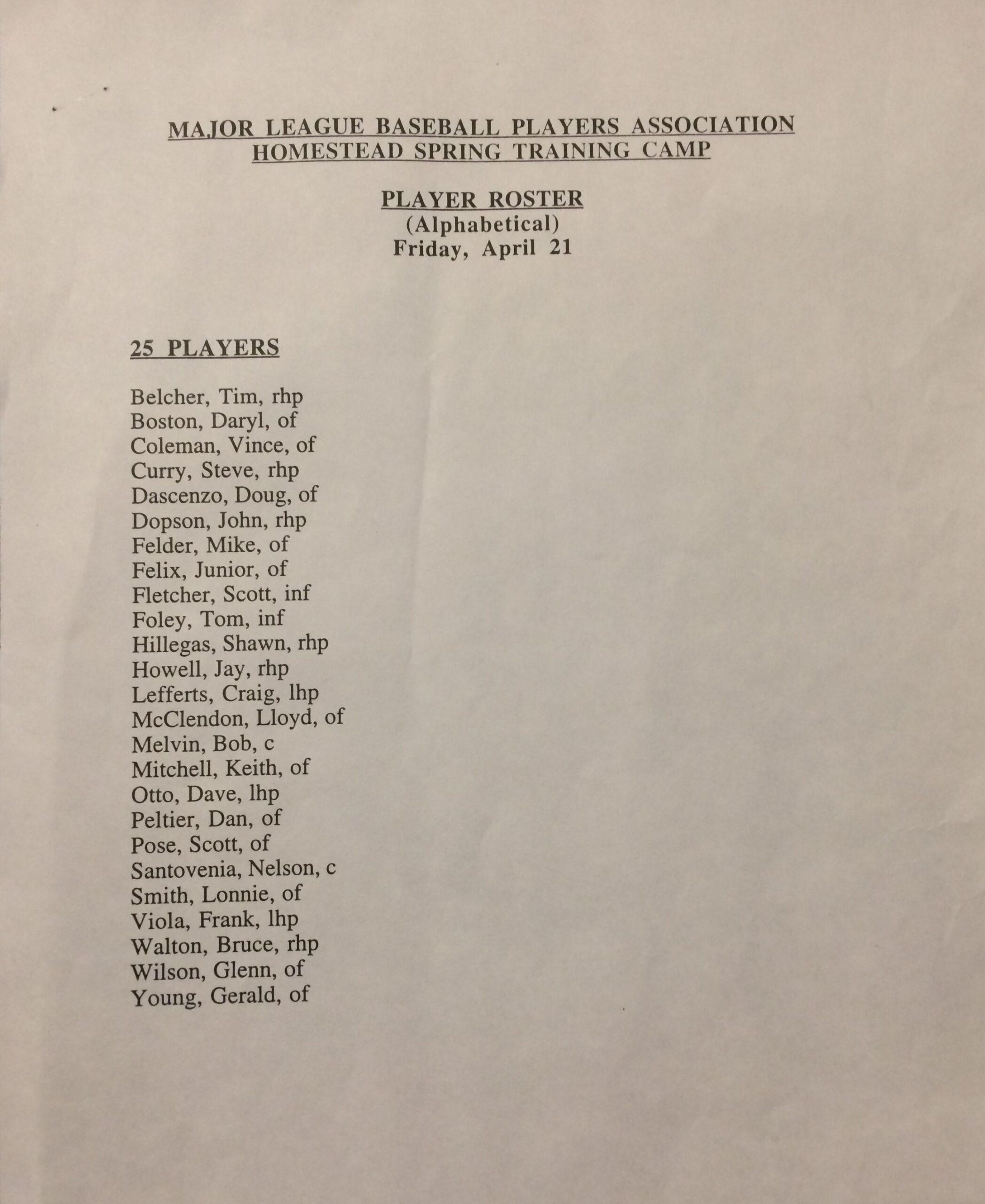Some members of that extra-large player pool had received offers from teams that they preferred not to play for, or that would pay them less than they thought they deserved. Others were waiting for any offer at all. “Everybody wanted to get into a place where they could work out and get into playing condition and demonstrate their skills, more or less, so that they could secure a contract to go back to playing in the major leagues when the season opened,” Fehr says. Having asked those same players to strike, the union now felt responsible for helping them return to the Show. “There was clearly not going to be a facility set up with the basics of a major league training camp and all the rest of that unless the union did it,” Fehr adds. “There was no agent or agent group or group of agents that could have done that or would have tried.”