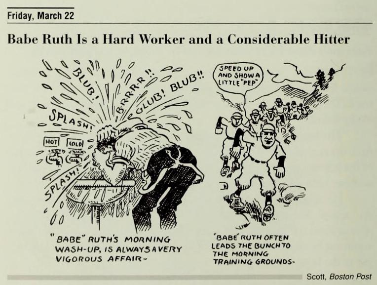 Ruth was also lauded for his work ethic, as the above cartoon shows, with the Boston Post noting that “any player who followed the pace that Ruth set … would have been hobbling about in crutches this noon, but Babe suffered neither ache nor pain, and no one [in Boston’s camp] will dispute his claim to the title of ‘Iron Man.’” (Future teammate Lou Gehrig might dispute that Iron Man claim.) Of course, that report continued, Ruth might have been pouring more effort into his workouts to finish early and find time to “sneak out to the race track and get down a couple of bets on the ponies.”
