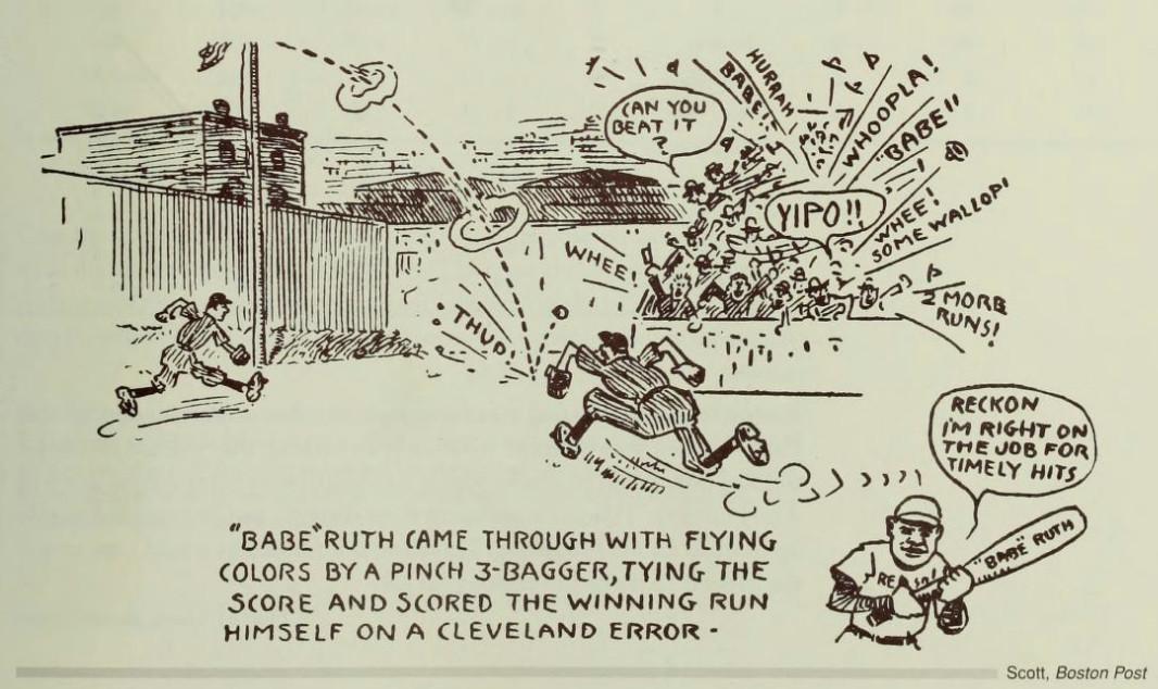 In 1918: On the last day of June, Ruth hit a game-winning home run off Johnson in the 10th; just a week later, on July 8, Ruth hit another extra-inning winner, with the walk-off homer depicted in the above cartoon (which was ruled only a triple, per 1918 rules) in a scoreless game in the 10th. Ruth won numerous other games in innings earlier than the ninth, too: On June 15, he hit a tie-breaking three-run homer in the seventh to beat the St. Louis Browns, and on July 6, he knocked a two-run, sixth-inning triple to tie the score, then scrambled home on an error to beat Cleveland.