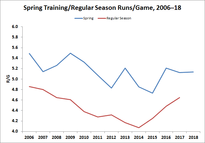Over the past 12 springs, the regular-season home run rate has been 12.2 percent higher, on average, than the spring rate. If that difference holds this season, the regular-season home run rate for non-pitchers would rise to 5.2 percent of non-strikeout at-bats, eclipsing last year’s 5.0 percent. It’s not guaranteed that there will be more homers hit in 2018 than last year’s total of 6,105, because there have been years when the spring rate rose without a corresponding climb in the regular-season rate. Given the magnitude of the increase this spring, though, it seems likely that the league will surpass 6,106, barring a significant change to the ball or in players’ approach.