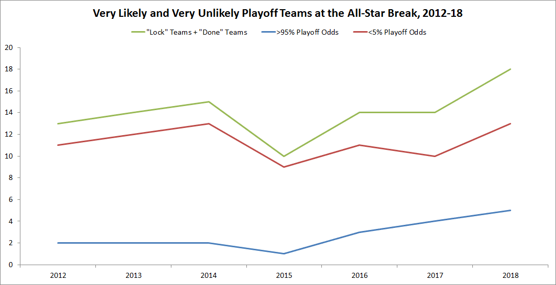 In part, that’s because there are more teams than usual essentially sitting this season out. The graph below shows the number of teams at the All-Star break in each season that have looked like shoo-ins for some playoff position—without specifying whether it’s a division championship or a wild card—or eliminated from contention for all practical purposes.