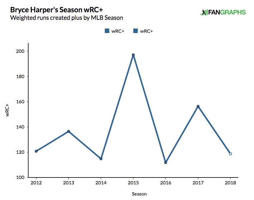 Harper has admittedly been far less valuable this season than his reputation would suggest. His defense has been suspect, if not worst-right-fielder-in-the-majors bad, and he’s on a downslope of his career-long yo-yoing pattern at the plate. By WAR, FanGraphs shows that 107 position players have been more valuable than Harper this season, and Baseball-Reference balloons that number to 239.