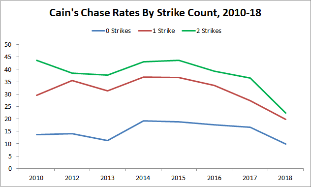 As FanGraphs’ Jeff Sullivan observed last month, much of Cain’s increased selectivity has come with two strikes. The chart below displays Cain’s chase rates in zero-strike counts, one-strike counts, and two-strike counts in each year of his career, with the “two-strike” line showing the steepest drop in 2018.