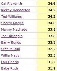 But that’s not a particularly likely outcome, and those exceptions are few and far between. Well more than half of the members of this group are in the Hall of Fame, and most of them continued playing well—or even improved—as they reached their late 20s. Heck, just look at a screenshot of the names next to Machado’s on the under-25 WAR leaderboard.