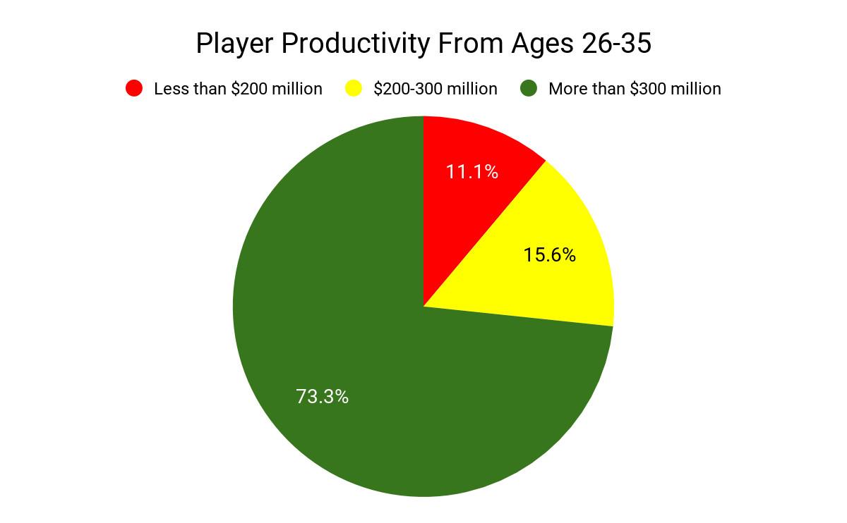 The FanGraphs explainer for wins above replacement uses 5 WAR as about the cutoff point for a superstar, so the team that places a winning bid on Machado or Harper will probably receive something like seven seasons of consistent star-level production and a relatively cushioned back end to boot. Overall, this average sums to 48.1 WAR over the decade. (And yes, perhaps Alex Rodriguez using steroids inflates the total a bit—but if anything, the total undersells the group at large because a handful of players lost time to World War II. Odds are Joe DiMaggio would have produced more than 0 WAR from age 27-29 had he been able to play baseball in that span, as Machado and Harper presumably will be.)