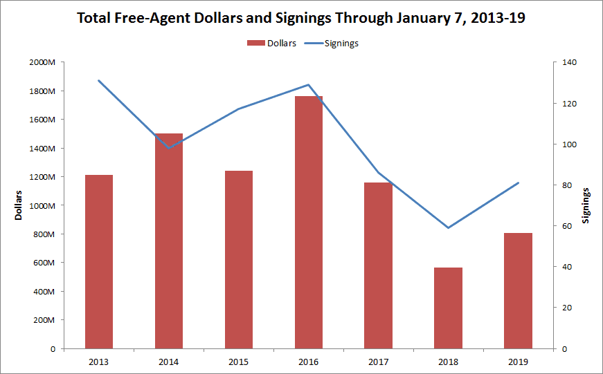 The chart below, based on data from Spotrac, shows the number of free-agent signings and the total dollars committed to free agents through January 7 of each offseason starting with 2012-13.