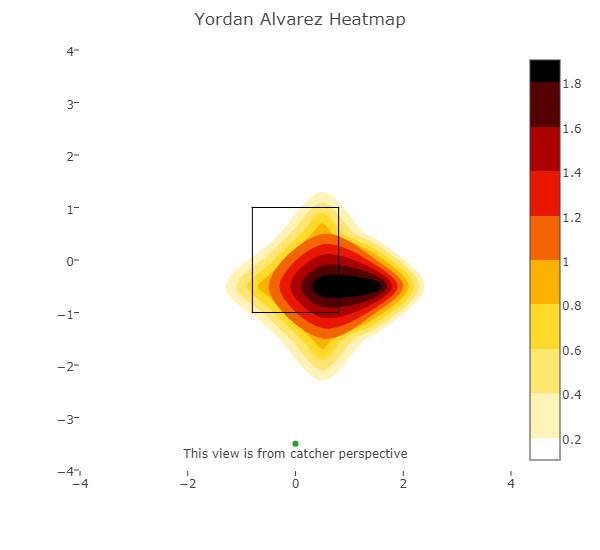 The explanation probably isn’t that he can’t catch up to good heat—or, at least, it wouldn’t be, unless fatigue is sapping his bat speed. If there is a game plan that the Rays and Yankees followed—and that Daniel Hudson employed to great effect in World Series Game 1—it was staying away from the places where he pulls pitches in the air, which is how he does much of his damage. Here’s where fastballs to Álvarez produced the most valuable pulled balls in the air during the regular season: low and in.
