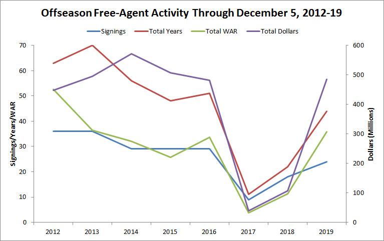 The question is whether we’ve really seen enough to declare that “the good old days” are back. Given the salary-suppressing prelude to this winter, this could be closer to a dead cat bounce than a true return to the old normal. As encouraging as the rebounds in the image above appear, the number of free-agent signings through December 5, and the years devoted to them, are all lower in 2019 than they were in every offseason from 2012 to 2016. The dollar total, which has soared to almost $500 million, is also lower than most of those years, in spite of inflation and rising revenues. This year has been heartening compared to the past two, but it’s still somewhat underwhelming on a longer timeline.