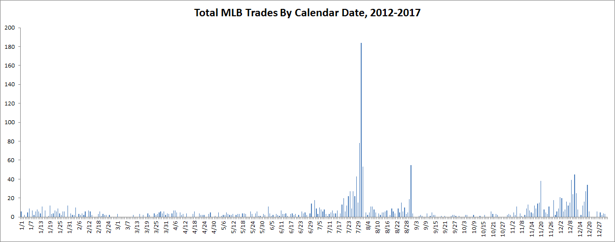 Even before this move was made, though, July stood alone in trade activity. The graph below, based on Retrosheet’s transaction data for the pre-2018 dual-wild-card era, shows the total number of trades by calendar date. July’s combined trade activity more than doubled August’s, which also trailed December’s.