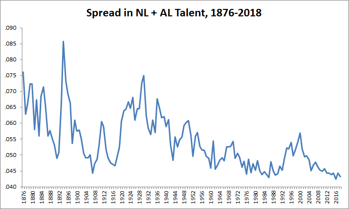 Lichtman also showed that the spread in talent—as represented by the standard deviation in wOBA, or how closely players’ performance is clustered around the average—has decreased over time, which is consistent with an increasing overall talent level. Although the spread spiked during the so-called steroid era of the 1990s and early 2000s, it’s been slight since then, as competition has filtered out the players who clearly don’t belong and made it more difficult for stars to separate themselves from the pack.