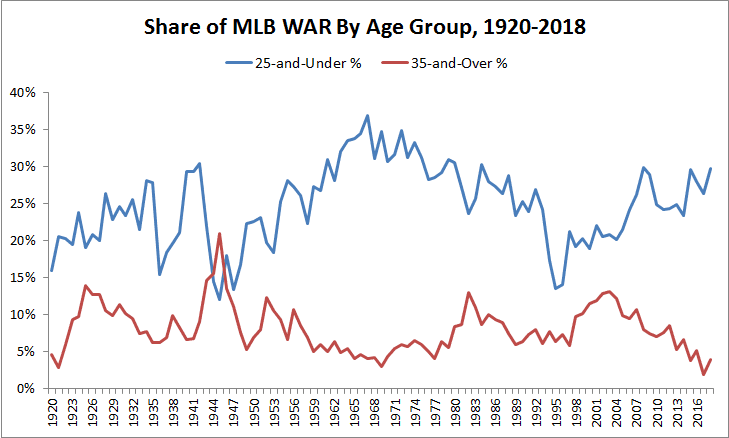 In 2018, hitters 25 or younger accounted for their highest share of MLB plate appearances since 1978, when free agency was still in its early days. Compared to the MLB baseline, they collectively recorded their highest walk rate and second-highest isolated power ever. If we group together all players 25 or younger and 35 or older, we find that in contrast to the old-player peaks of World War II and the steroid era, young players are dwarfing old players in their share of the league’s overall production. In 2017, the older group accounted for its lowest percentage of leaguewide WAR since the 19th century. It barely rebounded in 2018, when the younger group’s share came close to a 35-year high.