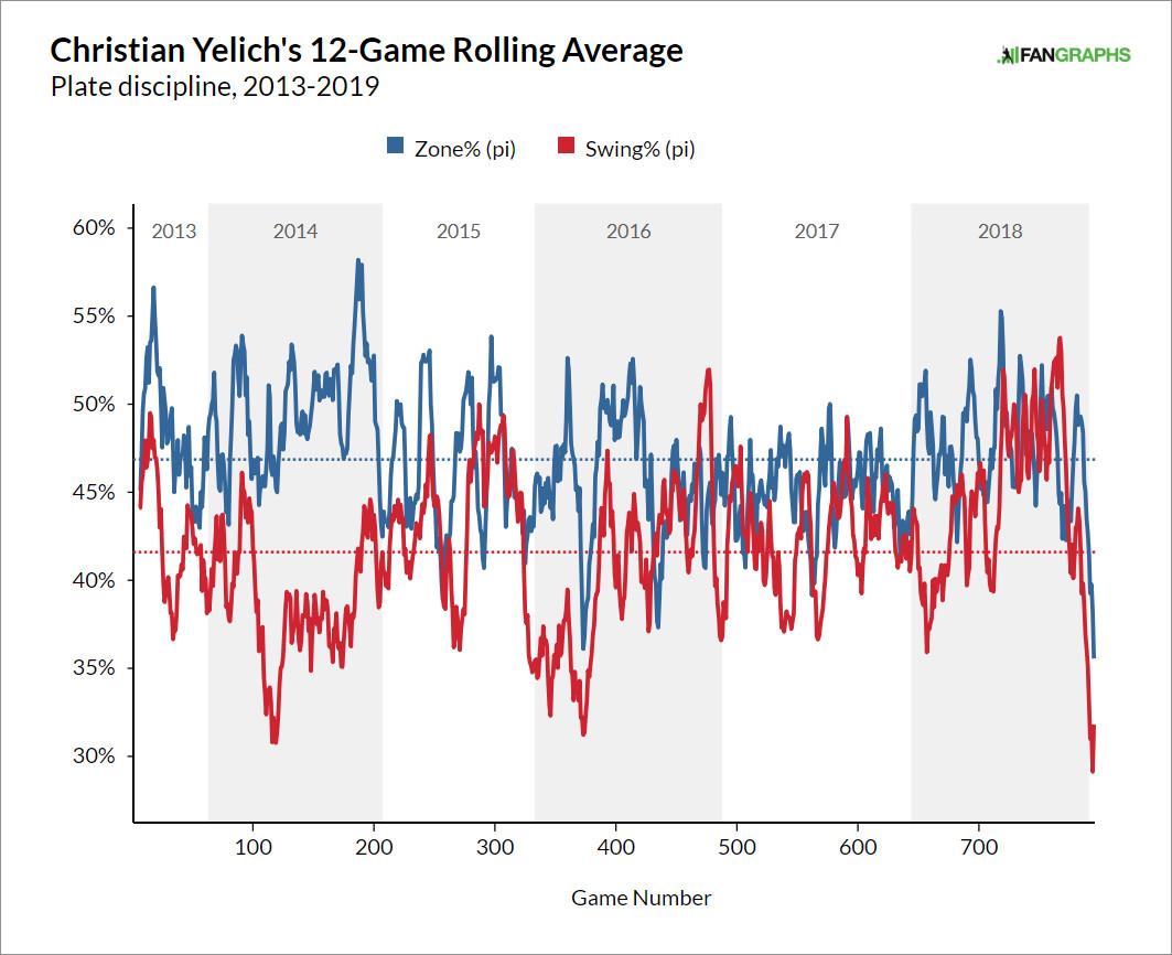 In fact, while one wouldn’t know it from the number of balls he’s sent into the stands, Yelich hasn’t swung a lot lately overall. The slugger’s recent swing rate has plummeted to a small-sample career low. That’s probably because he’s seeing fewer pitches to hit: Over the same span, the percentage of pitches in the strike zone against Yelich has also bottomed out.