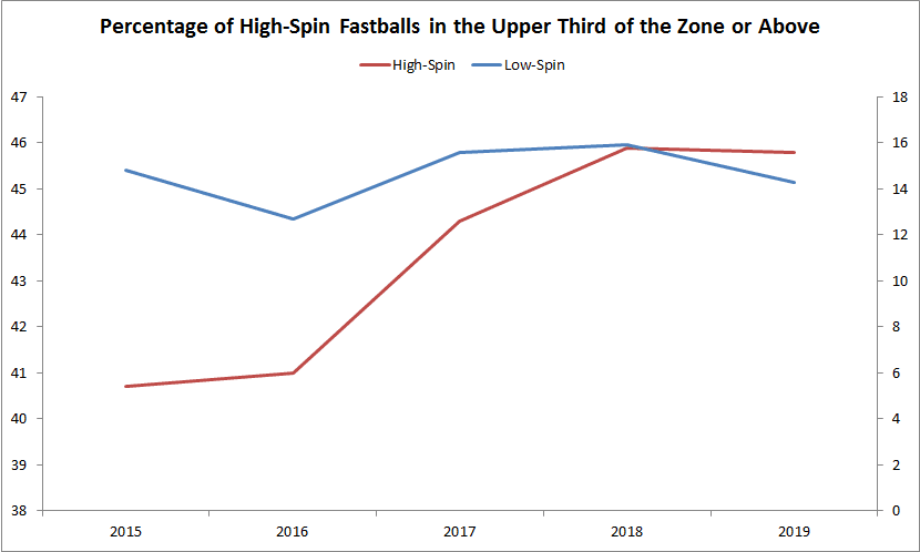 That trend toward throwing high-spin fastballs high in the zone is pervasive enough to stand out on a league-wide level. The average MLB four-seamer has averaged 2,259 RPM over the past four-plus seasons. The graph below shows the annual rate at which high-spin (>2,300 RPM) and low-spin (<2,200 RPM) four-seamers have been thrown in the upper third of the zone or above, revealing a clear increase in the former without an obvious corresponding increase in the latter.