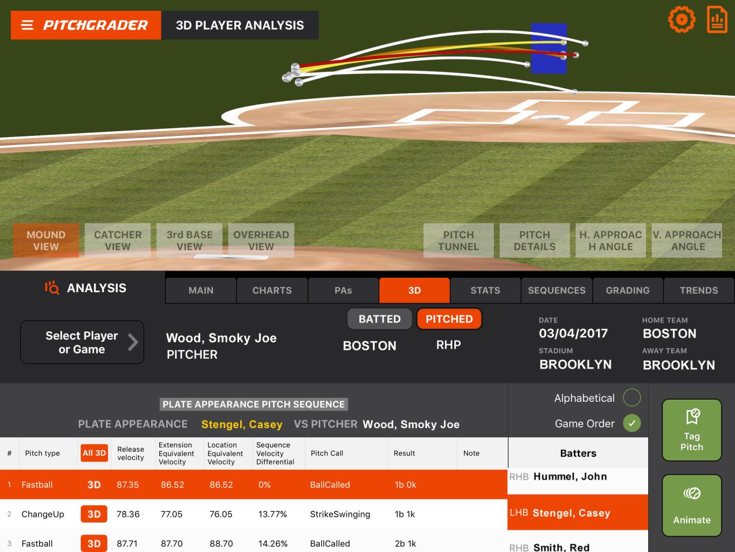 PitchGrader’s physics engine enables what Wayne calls “active projection,” allowing users to simulate what a pitch would look like if its spin rate, spin axis, velocity, or release angle were altered. The resulting interactive, animated, three-dimensional graphic presents what the pitch would look like from any perspective. “From a pitch-design standpoint, it’s been incredibly helpful,” Weiner says, citing its tendency to expedite buy-in. “It gives a lot of confidence to the pitcher understanding how that specific pitch looks and how it comes out of their own unique release point.”