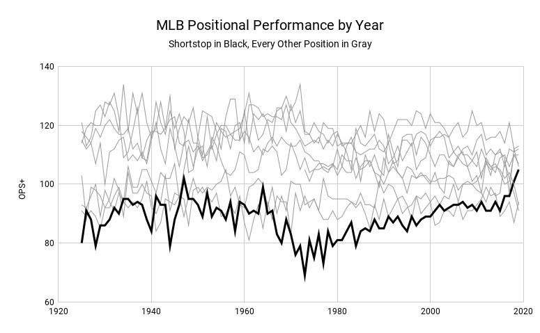 For all intents and purposes now, shortstops are power hitters, the same as everyone from every other position. Their combined OPS+ is 105, meaning they’ve hit 5 percent better than league average, which would be shortstops’ best-ever mark. They’ve almost always brought up the rear in terms of positional performance at the plate, but they’re in the middle of the 2019 pack. Their yearly performance is highlighted in black on this chart, while every other position is in muted gray.