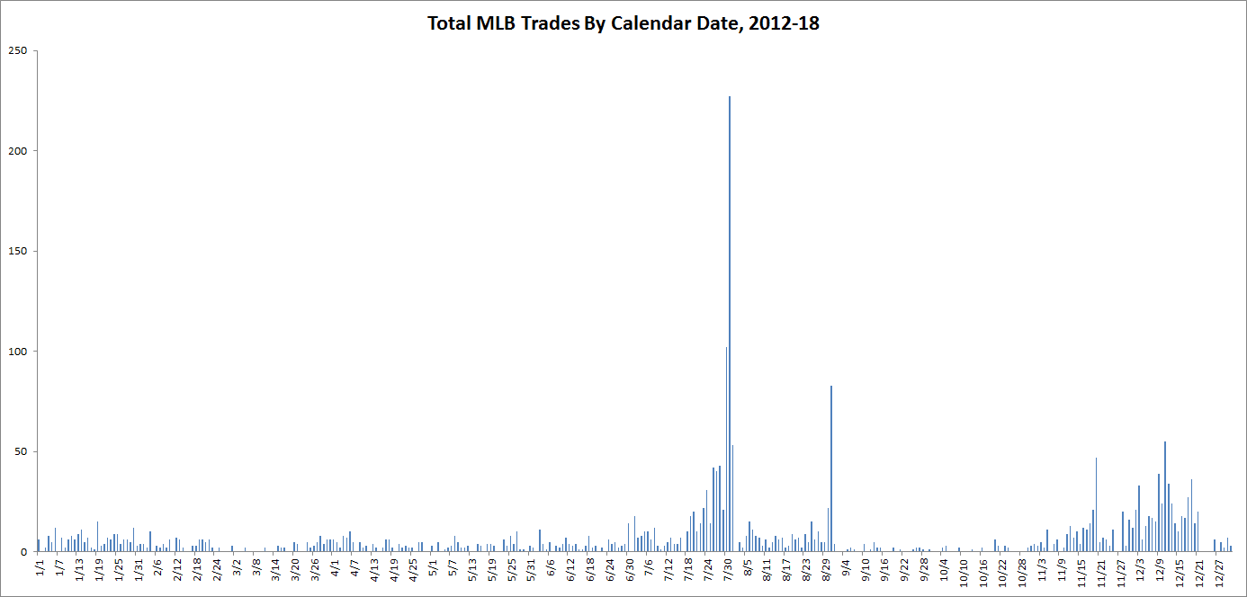 To gauge how much more trade activity we might see in July because that August outlet is gone, let’s look at all the trade activity in the seven years since the institution of the second wild card in 2012. The image below shows the total trades made on each calendar date from 2012 to 2018.