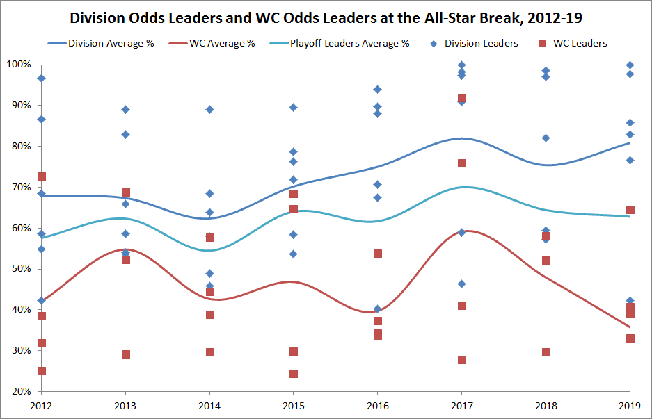 The current division favorites (represented by the dark-blue line) have higher average odds of holding on to take their respective titles than any crop of midseason division favorites from 2012 to 2018. The current wild-card favorites, however, have lower average odds of fighting off their challengers than any previous cohort of wild-card favorites. Despite the parity in the NL Central, where the last-place Reds are closer to first than the second-place team in any other division, most of the division leaders are sitting pretty enough that they don’t have a huge incentive to add at the deadline for the purposes of retaining those top spots (although they may still want to add for October). And even if they did want to call in the cavalry, it’s not easy to see where that cavalry would come from, because so many teams are within theoretical striking distance of a wild-card spot that they either won’t want to sell or may be wary about the backlash from their fans if they concede.