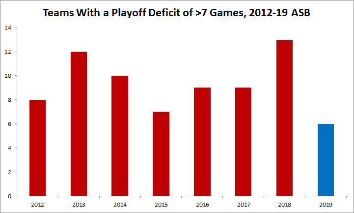 At this year’s All-Star break, only six teams—the Orioles, the Royals, the Tigers, the Blue Jays, the Mariners, and the Marlins—were more than seven games out of the closest playoff spot. That’s easily the lowest number of way-out-of-it teams we’ve seen at the break in any season since the advent of the second wild card.