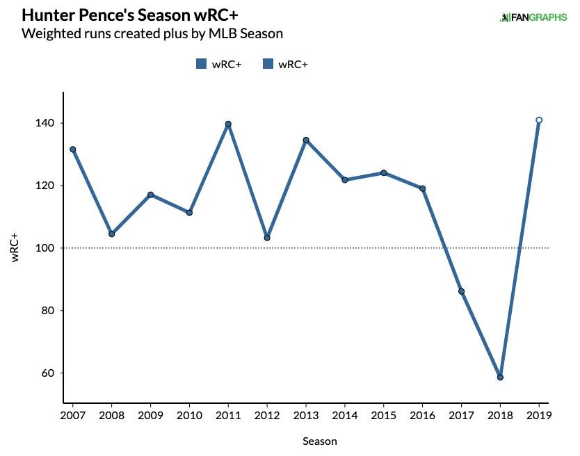 Pence’s career was done. Cooked. Through. His wRC+ dropped to 86 in 2017, then 59 in 2018, when he hit just four home runs in 248 plate appearances. In fewer trips to the plate this year, he’s already at 15 home runs—and sure, the move from San Francisco to Texas helps, as does the 2019 ball, but those factors explain just a fraction of his success. Pence’s current 141 wRC+ would be his best ever for a season, and he hasn’t delivered an extended offensive stretch this good in a half-decade.
