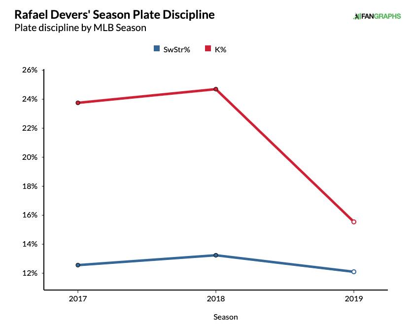 A player’s K rate is usually about double his whiff rate, so Devers’s previous strikeout ratios make sense (25 equaling twice 12.5). If we generated “expected” strikeout rates in 2019 based on players’ underlying swinging-strike rates, we’d predict a similar number for Devers: 22.2 percent. The difference between his expected and actual rates is one of the largest in the majors.