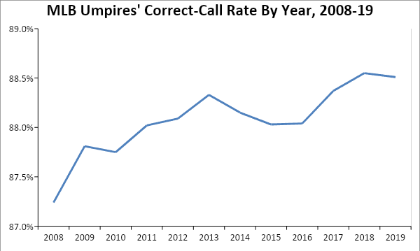 Umpire perfect games are so scarce because umpires make many calls in most games and because it’s difficult to call pitches precisely when they’re flying as fast and moving as much as major league offerings do. MLB umpires are presumably the best in the world at that challenging task, but they still succeed only about 88.5 percent of the time, a rate that’s risen slightly since the start of the PITCHf/x era. The graph below shows the leaguewide correct-call rate by year, according to data provided by Baseball Prospectus writer and researcher Lucas Apostoleris, who used park-corrected pitch locations and the strike-zone definition developed by former BP analyst Mike Fast, which incorporates stringer-recorded bottom boundaries, batter-height-dependent upper boundaries, and horizontal boundaries that correspond to the two points where the edge of the ball touches the plate.
