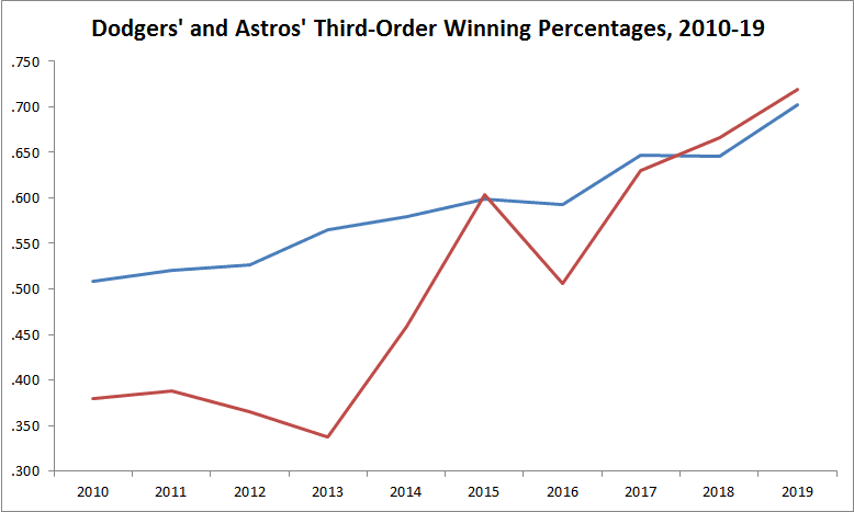 This was a season of extremes: Eight teams finished with triple-digit win or loss totals, surpassing the previous record of seven. The standings were extraordinary on the high side alone: Never before had four teams won at least 101 games. But we shouldn’t simply lump the Astros and the Dodgers together with the Yankees, the Twins, and the other excellent teams of 2019; they’re in rarefied air of their own. The table below lists the largest differences in third-order winning percentage between the best and second-best teams in either league in any season since 1950. The Astros and Dodgers are the only two teams in that time to finish at least 105 points ahead of the next-best team in their circuit.