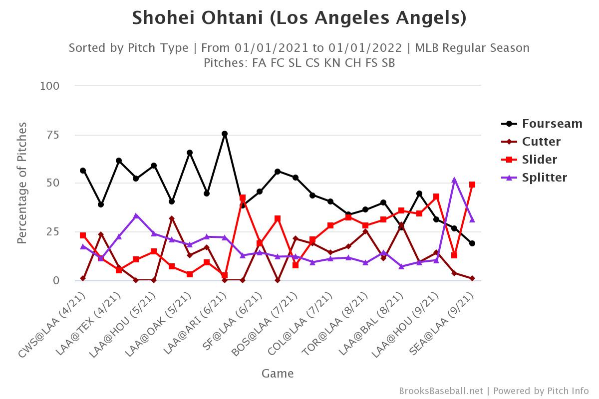 Ohtani’s four-seamer ranged from 76 percent of his pitches in one start in June to 19 percent of his pitches in one start in September. His cutter could be anywhere from almost a third of his offerings to entirely absent. His slider topped out at 49 percent usage and bottomed out at 2 percent usage. As for his splitter, he switched from throwing it 7 percent of the time in a late-August game to 52 percent of the time less than a month later.
