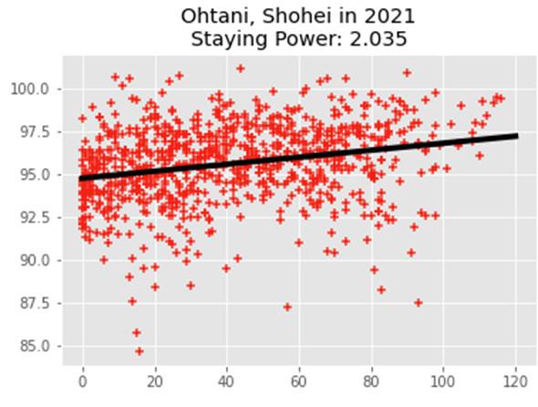 Staying power measures the average increase in four-seamer speed over 100 pitches. A staying power of 1.0 represents a pitcher who, on average, throws four-seamers 1.0 mph faster on pitch 100 than on pitch 1. Among pitchers with 100-plus innings pitched this season, Ohtani’s staying power of 2.04 trails only Carlos Rodón’s 3.42. Rodón (this year and in 2018), Verlander (in 2012), Bartolo Colon (in 2015 and 2013), and Johnny Cueto (in 2014) are the only qualifiers who’ve surpassed Ohtani’s 2021 staying power in a season.