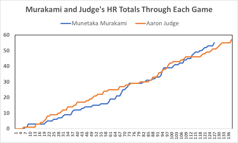 Murakami, who has earned a new nickname this year—Murakami-sama, or “Mura-god”—has already set some records: He became the youngest NPB player to hit 40 homers (surpassing Oh and fellow Hall of Famer Koji Akiyama) and the first to go deep in five consecutive plate appearances. And while the shorter NPB season may prevent Murakami from hitting as many homers as Judge—even though he’s proved durable again, missing only one contest—he has outpaced Judge’s tally through the same number of player games.