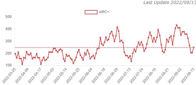 What makes Murakami’s monster season even more astounding is that—despite the best efforts of Murakami himself—offense is significantly down in Japan. No one knows why, but suspicions about the ball abound; the league says the ball hasn’t changed (though the packaging has), but NPB secretary general Atsushi Ihara has a history of secretly tampering with the pill’s construction. Whatever the cause(s), leaguewide OPS in the Central League is down 19 points since last season, 35 points since 2020, and 51 points since 2018. If NPB’s ball, like MLB’s ball, has been deadened, it hasn’t seemed to bother Murakami, and he’s only heated up as the season has gone on. In June, he hit .410/.515/.940 with 14 bombs; in August, he slashed .440/.588/.987 with a dozen dongs. Murakami’s 10-game rolling wRC+ chart looks like the heart rate of everyone who’s watched him. “The spotlight has grown brighter and brighter, because he really hasn’t slowed down,” says Jason Coskrey, who covers Japanese baseball for The Japan Times. Neither has his team: At 73-53-2, the Swallows sport NPB’s best record by a wide margin.