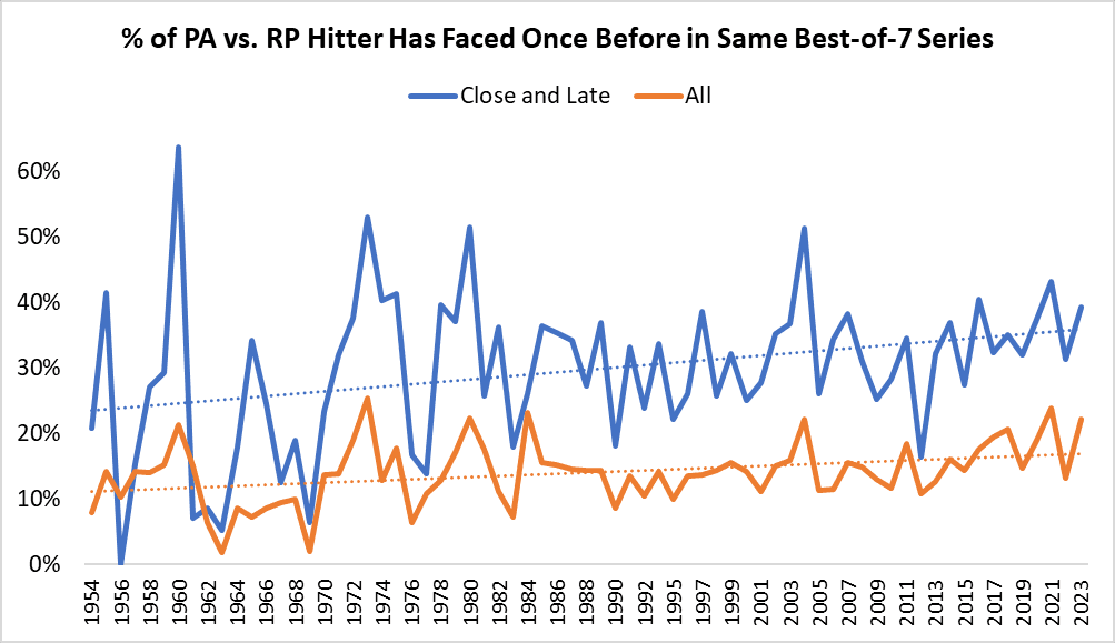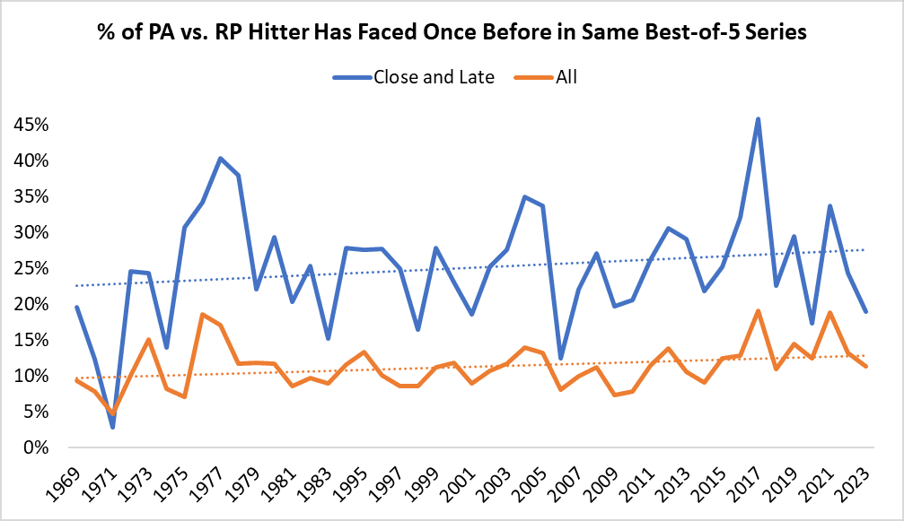 In other words, trying to avoid one kind of penalty in the playoffs may have caused teams to run right into another. Indeed, it does appear that relievers whom hitters have already faced once in the same best-of-five or best-of-seven series make up a higher percentage of all plate appearances and “close and late” plate appearances (those in the seventh inning or later, with a score differential of no more than three runs in either direction) than they used to.