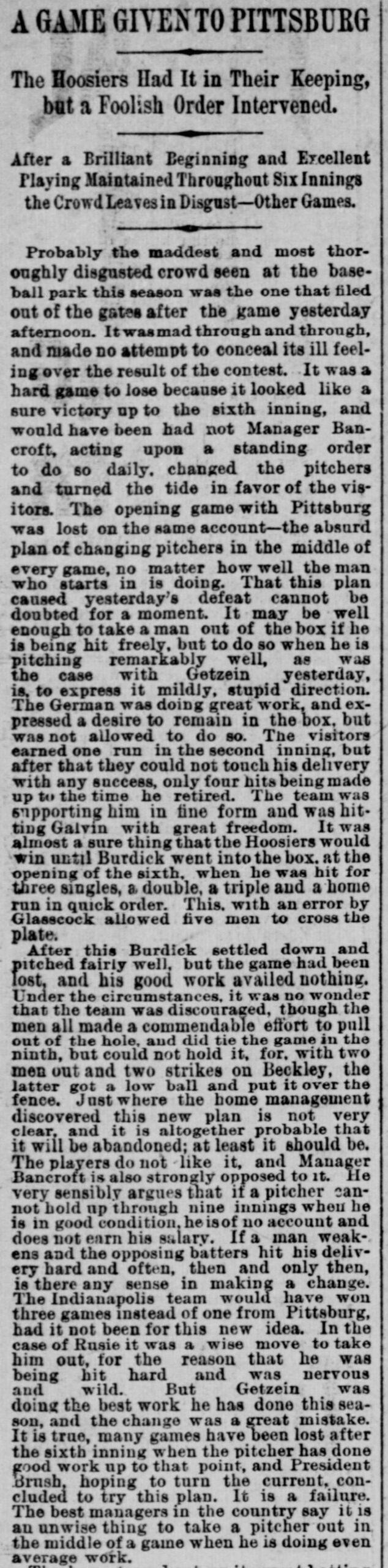 John T. Brush, the owner of the National League’s Indianapolis Hoosiers, was an outsider who bought into baseball, and he had some strange ideas—one of which was to pull his starters before they could blow the game. As one newspaper account explained, “As the team has been losing games in the seventh inning, generally through the inability of the pitcher to hold up, Manager [Frank] Bancroft yesterday concluded to make a change at the end of the fifth, and for that reason, and not because [Bill] Burdick was being hit hard, [Pretzels] Getzien went in at the opening of the sixth.”