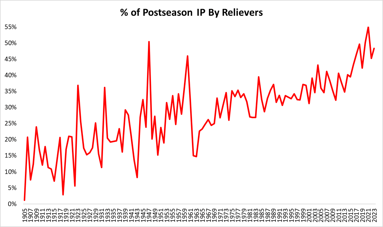 You may have seen a graph like the following one before. It shows the yearly percentage of postseason innings thrown by relievers. Lately, the rate of reliever-thrown frames has hovered around 50 percent.