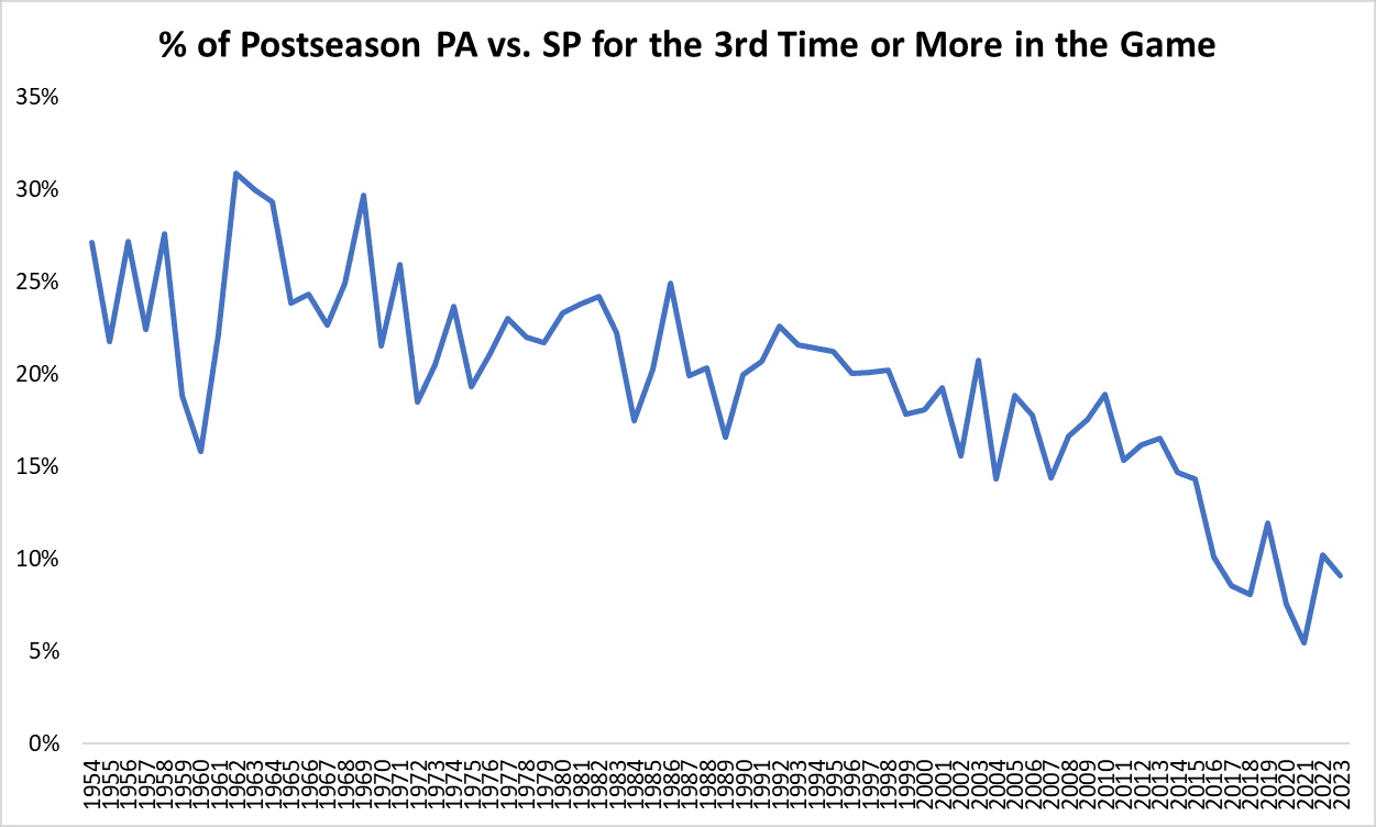Although the rates fluctuated more from year to year in the early seasons in the sample, when the postseason consisted of the World Series alone, the general trend over time has been toward a higher percentage of innings thrown by relievers. And that increase has accelerated in the past several years.