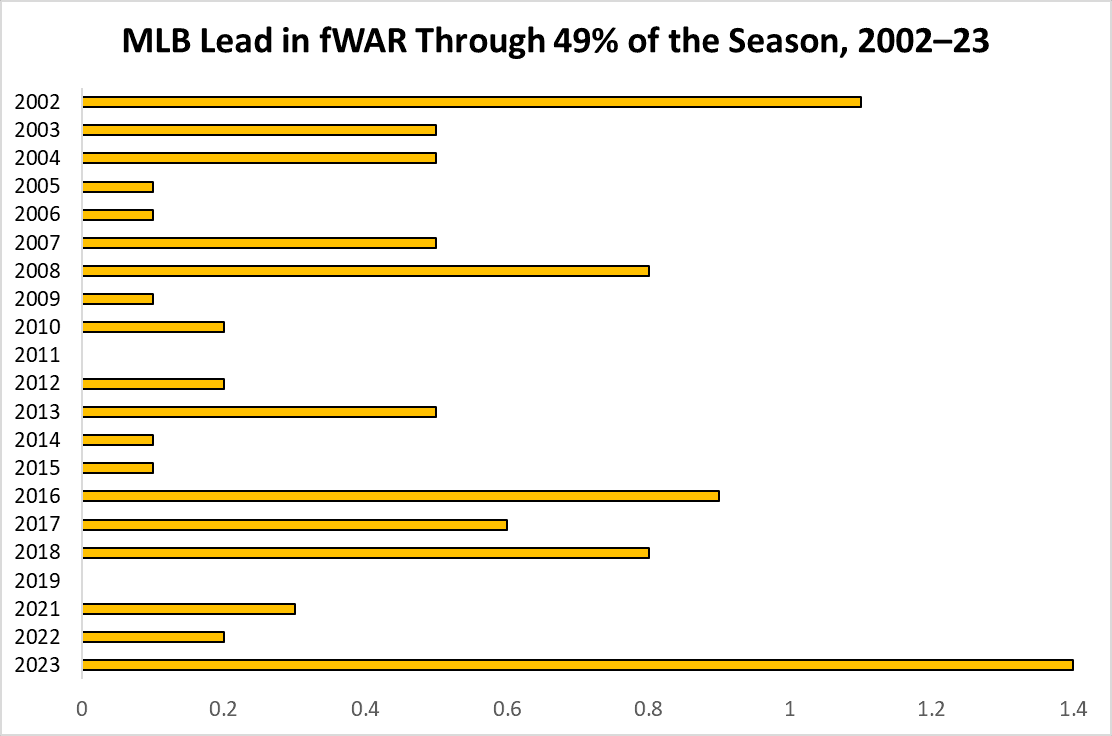 Through Monday, 1,189 of this season’s 2,430 games had been played. That’s 49 percent of the regular-season schedule. (The 44-37 Angels, who have a roughly 50-50 chance to make the playoffs thanks in large part to Ohtani, sit precisely at their halfway point.) WAR is tricky to research on a game-to-game level—it’s not really designed to work that way—but FanGraphs does make it possible to search for WAR produced over precise time spans since 2002, so I looked up the point in every season since 2002 (excluding 2020) that was closest to the current 49 percent mark. Then I graphed the gaps in each league between the WAR leaders and their closest competitors through those dates. (Years with no visible bars indicate ties at the top of the leaderboard.)
