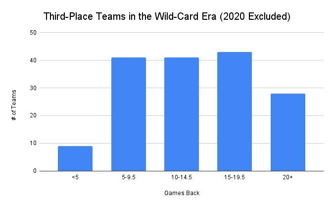 While it happens on occasion—in that 2007 NL West race, all three teams entered the final series of the season with a chance to claim the division crown—it’s still extremely rare for three-team races to last all the way to the finish line. Overall, the average third-place team in the wild-card era has finished 14 games back of first.