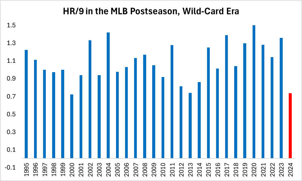 The graph above, based on info from FanGraphs, is very likely misleading, because offense is always suppressed in the wild-card round, when teams tend to deploy their best pitchers. (The home run rate in this year’s wild-card round wasn’t that different from 2022’s.) Thus, it’s too soon to say this is real—unless you’re trying to be on your boldest behavior.