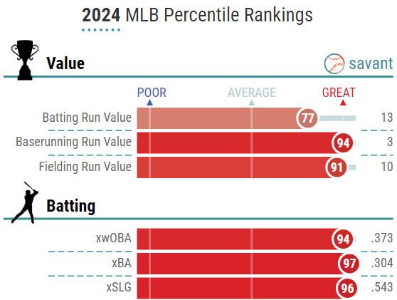 The 21-year-old left-handed hitter may be best known to most fans as perhaps the only player plausibly standing between Paul Skenes and the NL Rookie of the Year Award, but it’s time for the season he had to gain greater national recognition. His double and two-run triple in Game 2 against the Braves, in addition to his clutch recovery to catch Jorge Soler’s leadoff laser in the ninth, gave glimpses of the glove, legs, and power that propelled him to an All-Star appearance and 5.3 FanGraphs WAR—1 WAR more than Skenes, who wasn’t promoted to the majors until May 11.