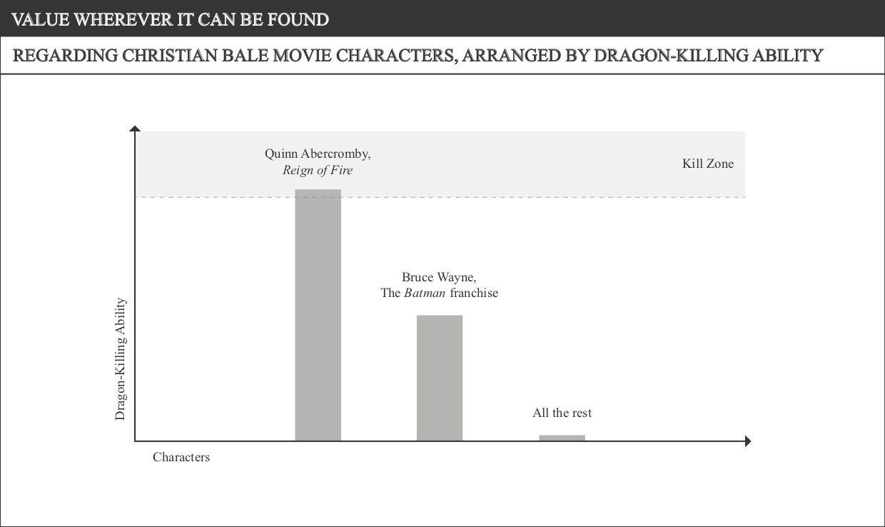 Bale has a new movie coming out this week. It’s called Ford v Ferrari. And, Bale being one of the most talented working actors on the planet, I am very excited for it. So much so, in fact, that I spent the past several days rewatching every movie that Bale played a major role in over the past two or so decades—even Terminator Salvation, which is how you know I took this seriously. As such, below are some charts. They’re all about Bale, about some aspect of his movie existence, be it a movie-specific thing or a general career thing. Some of the charts have accompanying text underneath them. Others do not. That’s what this article is.