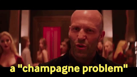 Two weeks ago, we saw John Wick possibly decapitate Boban Marjanovic with a book. On Friday, we saw Deckard Shaw make a foray into cold beverages. “I’m what you might call a champagne problem,” he says in the middle of what looks like a party. This line either doesn’t make sense—because a “champagne problem” is a trivial rich-person grievance, and I don’t think Shaw is self-evaluating like, “lol it me, a white people problem, amirite?”—or it’s a direct admission that Shaw listens to Nick Jonas. But anyway, the only reason he said is because he was planning to decapitate a person by popping a bottle of champagne.