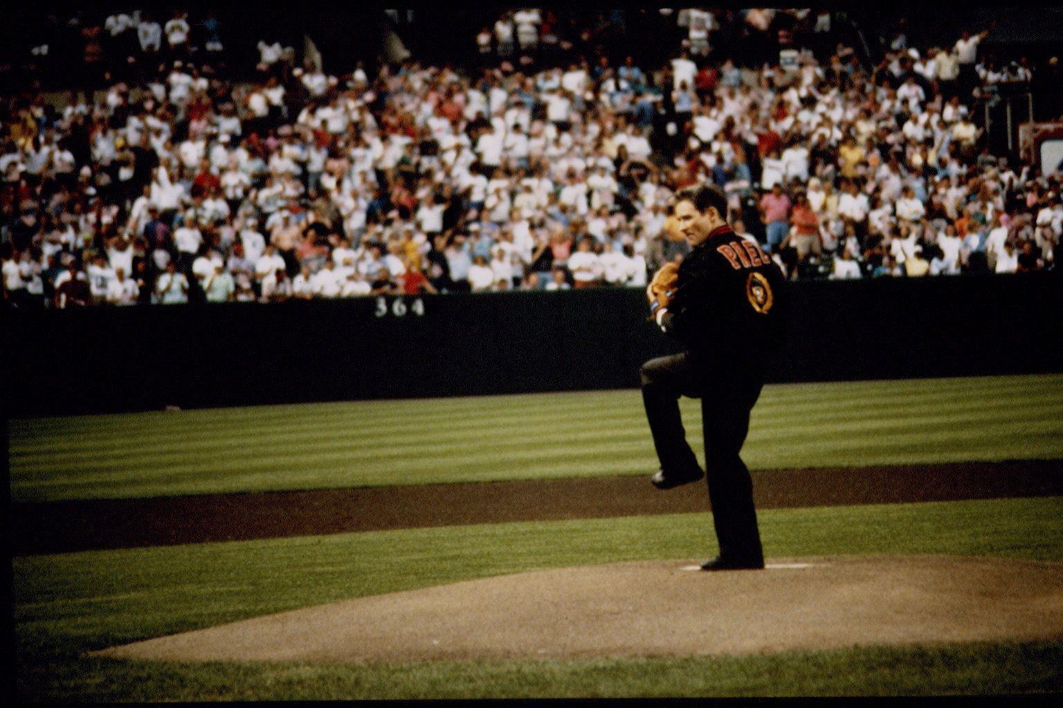 No stage was too big for Kline. One of the first things Reitman shot was in Baltimore in front of almost 46,000 fans. Before an Orioles game at the newly opened Camden Yards, Dave throws out the ceremonial first pitch. It reportedly took four takes for him to almost find backup catcher Jeff Tackett’s glove. “No matter,” The Baltimore Sun stated, “Mr. Kline jabbed the air in victory and accepted the cheers of the mob as he jogged off the field.”