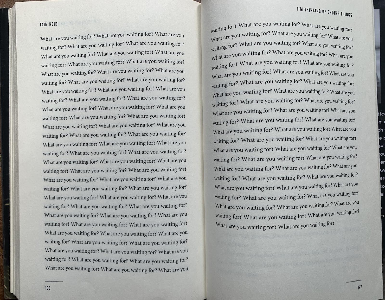 Reid’s novel is narrated by a young woman going on her first long car trip with her new boyfriend, Jake, to meet his parents at his childhood farmhouse. It’s snowing. She’s thinking of ending … things. Creepy parents. Creepy dinner. Creepy basement. Jake keeps getting … creepier. Some other creepy guy keeps calling her. Afterward, despite the blizzard, they stop at a creepy ice-cream joint, then at a way creepier old high school. Somewhere in there is a [redacted] pig, but not a [redacted] cartoon pig, an elderly janitor but not a [redacted] elderly janitor. Here are pages 196 and 197.