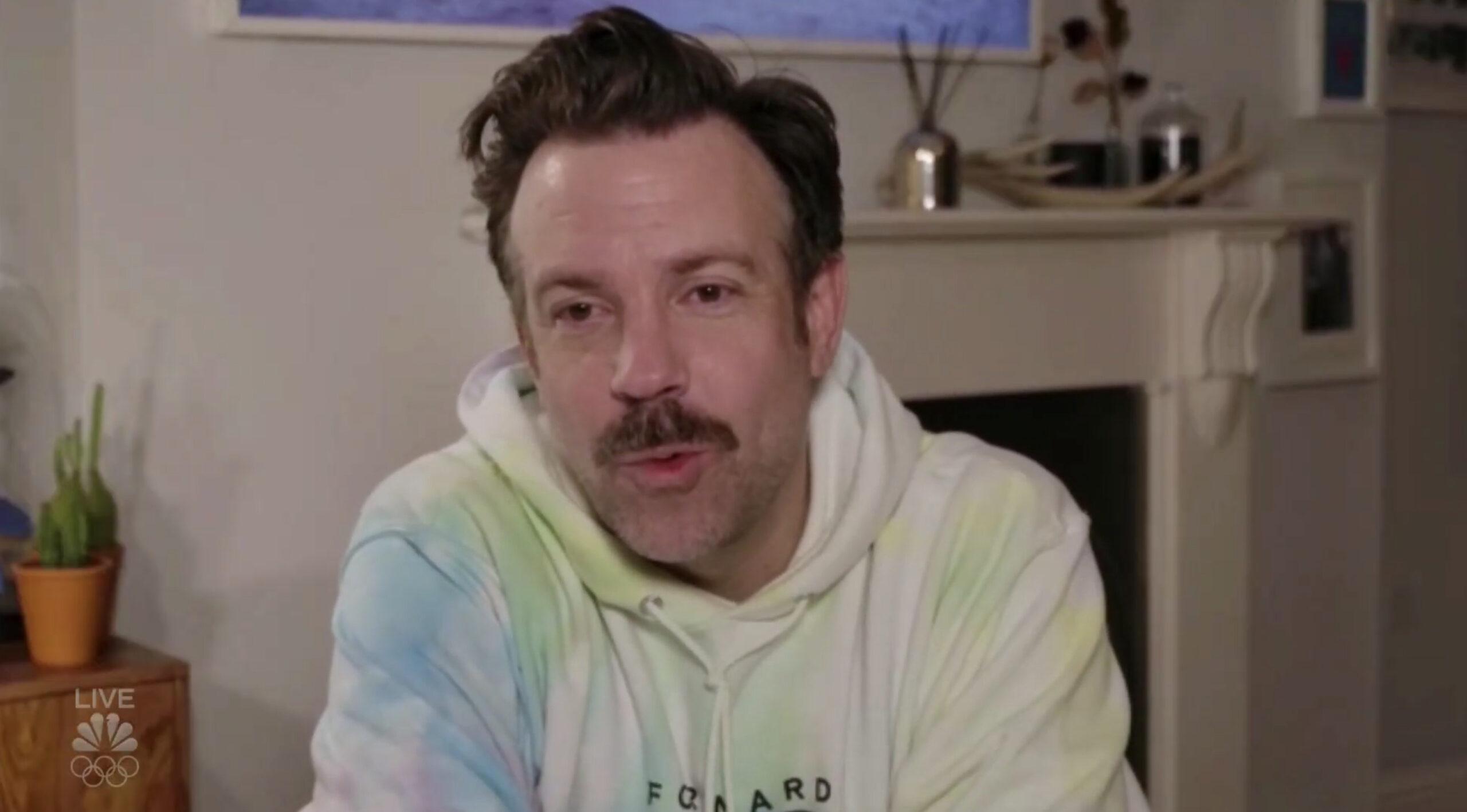It was past 2 a.m. in the U.K. when Jason Sudeikis accepted his (MUCH DESERVED) award for his lead performance in Ted Lasso, which might explain why his eyes looked so bloodshot, why the speech ran on so much that his fellow nominees were asking him to wrap it up, and why he was wearing a cozy hoodie. (He’s currently in England filming the second season of the series.)