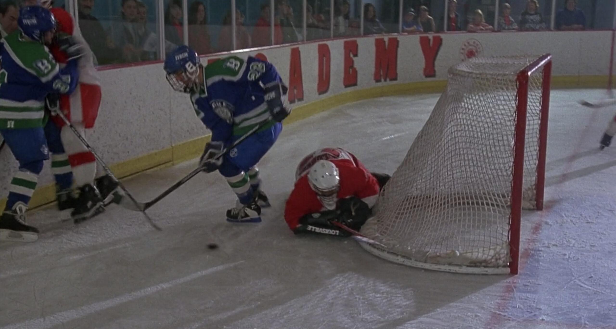 I can barely describe how bad he is. For much of the first movie, it seems he can hardly grasp the concept of goaltending, let alone how to physically do it. The amount of goals against that he’s solely responsible for is mind-blowing. It’s difficult to overstate how frequently he’s out of position. And not, like, in a small way—this kid is leaving the net absolutely GAPING on a regular basis, in all three movies.