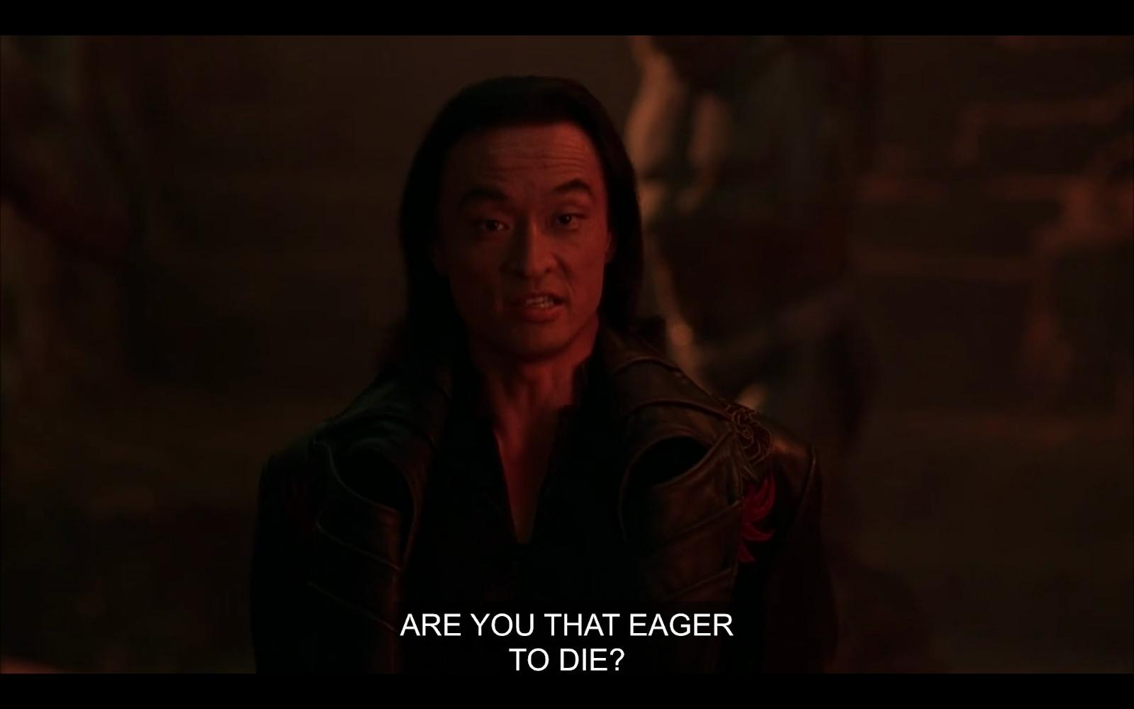 Shang Tsung, of course, is an evil sorcerer who has seized control of Outworld and is now hosting, on his own private island, the once-in-a-generation Mortal Kombat tournament, a crucial step in his ultimate plan to—what the hell am I even doing here. You either know the plot better than I do or you don’t give a hoot. Various fighters pound the bejesus out of one another on a poorly lit private island whilst 1990s-ass EDM blares. There you go. Shang Tsung is the bad guy, which is to say the enslaver of souls, as he is eager to remind you.