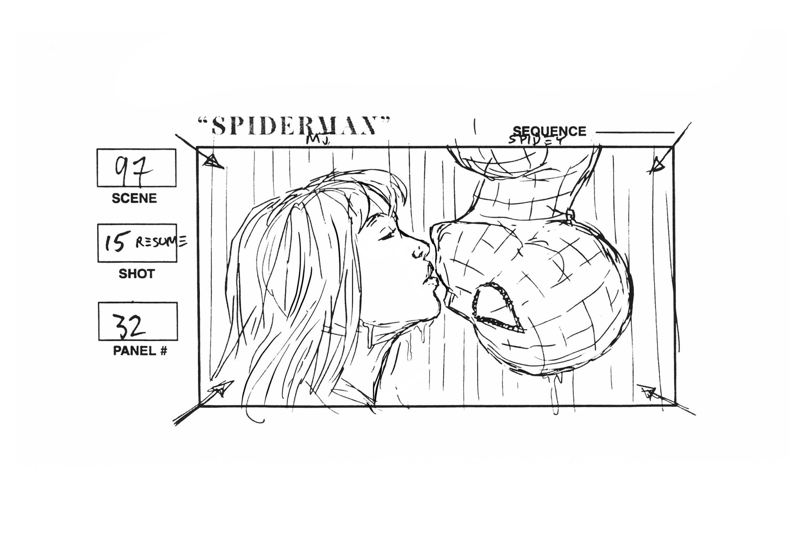 Raimi loved Lefler’s sketch—especially after producer Laura Ziskin suggested Mary Jane remove part of Spider-Man’s mask to kiss him. And though the alley wasn’t exactly Fifth Avenue’s beatific perch (which would eventually be used for a different scene), the change in location—and body position—enabled Raimi to shoot in a more controllable, backlot environment. “He latches on to things,” Lefler recalls. “If you explain it to him and you present it in a cinematic way that he can understand, he’s very tenacious about it.” With the updated boards, writer David Koepp and producer Alvin Sargent began revising the scene, spinning Spidey’s acrobatic antics and Mary Jane’s surprise attraction into the script and setting up what would become the movie’s most indelible shot.